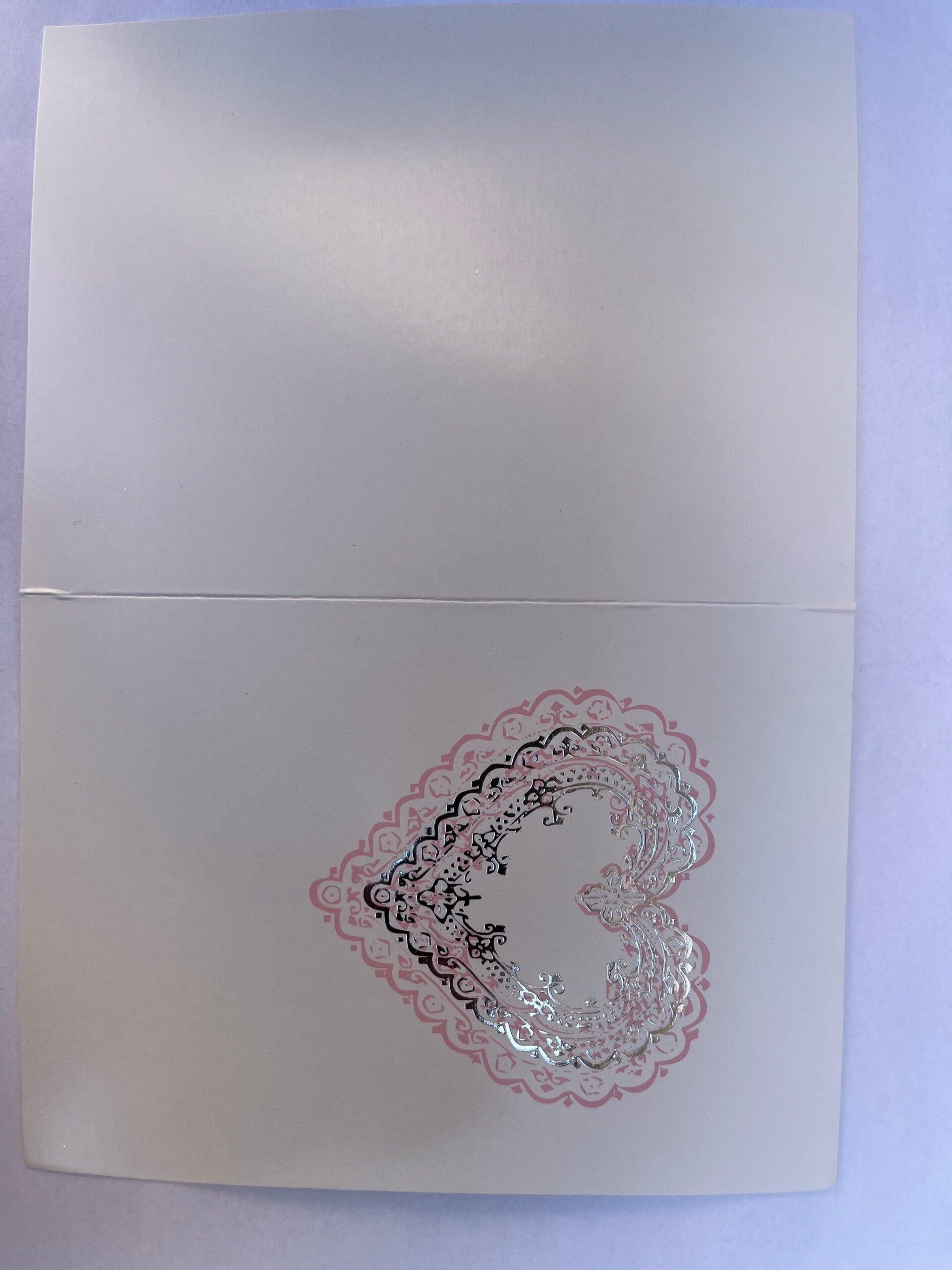 Elegante trouwuitnodiging met een prachtig zilverfolie hart op een witte achtergrond en subtiele roze details. Binnenin ruimte om zelf alle informatie over de bruiloft in te vullen, zoals datum, tijd, locatie, plaats en RSVP.